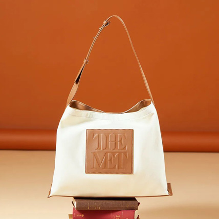 帆布包 包身拼貼棕色PU皮革,正面皮革燙印了大都會藝術博物館的英文LOGO,棕白撞色很有文藝感。