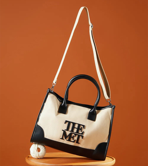 帆布包正面是黑色皮革的大都會博物館縮寫LOGO,背后刺繡了博物館全稱。
